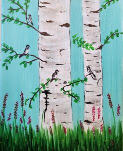 Chickadee-dee-dee…let’s paint birch and chickadees. Paper birch is distinct for its peeling bark. Traditionally, Native Americans used it for canoes and crafts. Chickadees are cute, social, curious birds. They acrobatically forage for food and store food for the winter. Using acrylics, create an 8 x 10″ painting. Enjoy life and de-stress.