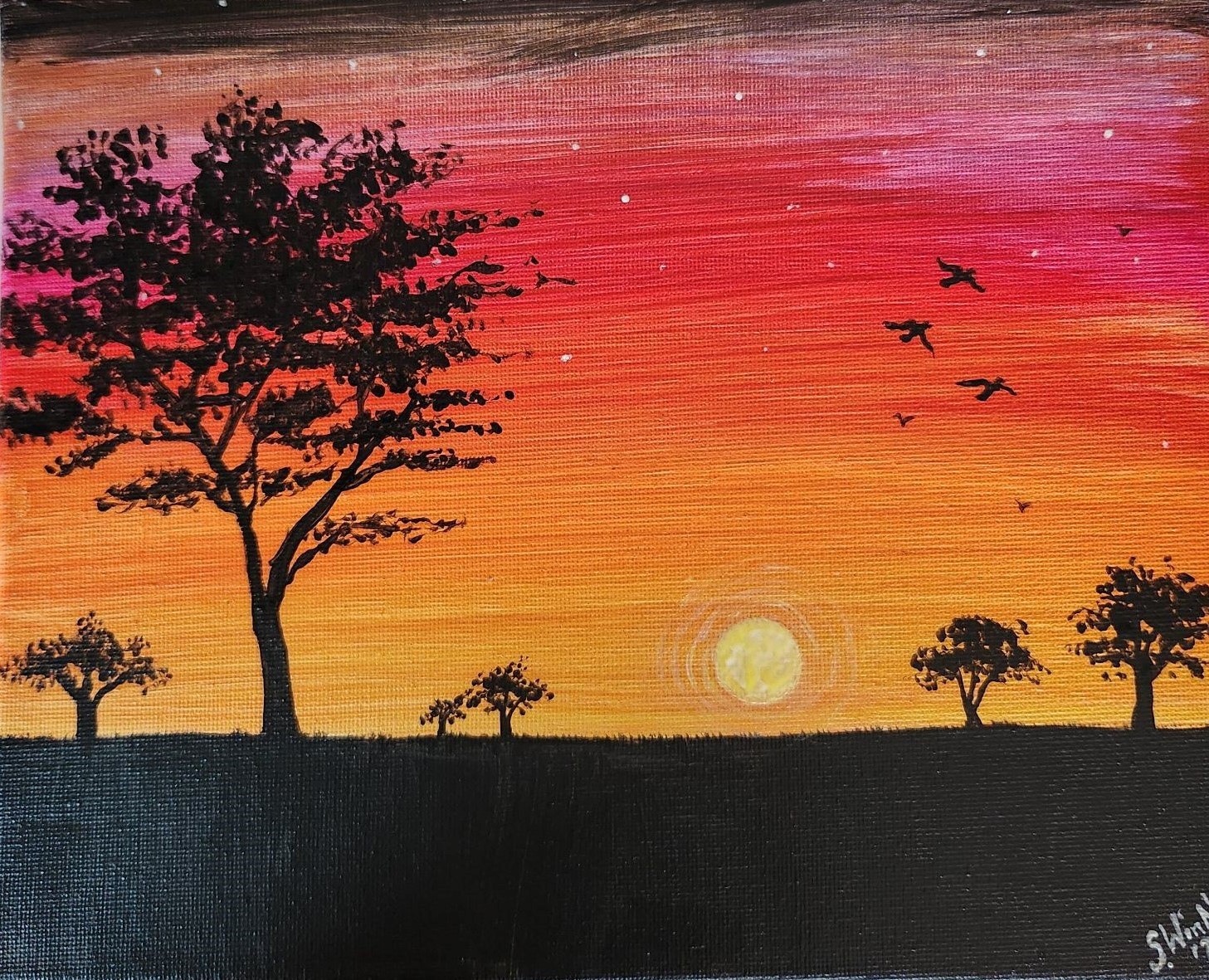 Taking time to admire a sunset and a starry night are good ways to destress after a long day. On this 8″ x 10″ painting, each person can choose their sunset colors. The black portion can be changed using trees, grasses, and/or a choice of animals using stencils. It’s time to enjoy life and live a little… come paint with us!